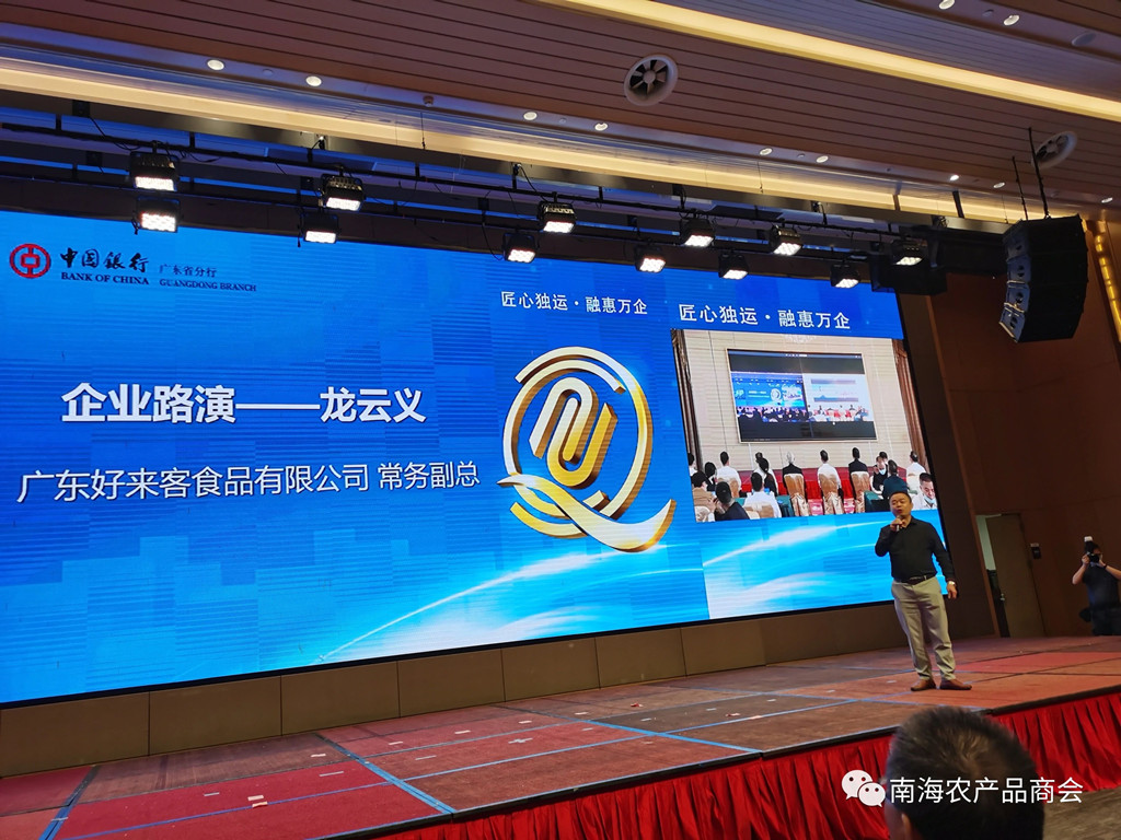 11月26日下午,由中国银行广东分行主办的中银中小企业“融资融智南粤行”佛山+云浮站产业集群融资专场活动隆重举行,南海农产品商会陈胜忠常务副会长代表商会与中行签署战略合作协议,让普惠金融助力各会员企业去持续发展,共同解决中小企业“融资难融资贵"问题等。同时,南海区农产品商会会长单位广东好来客食品有限公司常务副总龙云义在当天也进行企业路演。
