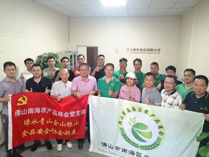 (上图前排右一为南海区农产品商会党支部书记、5月轮值小组组长、常务副会长单位佛山市朝成饮食管理服务有限公司总经理张朝生;后排左二为南海区农产品商会理事单位广东尝元绿色食品有限公司总经理吴文全)